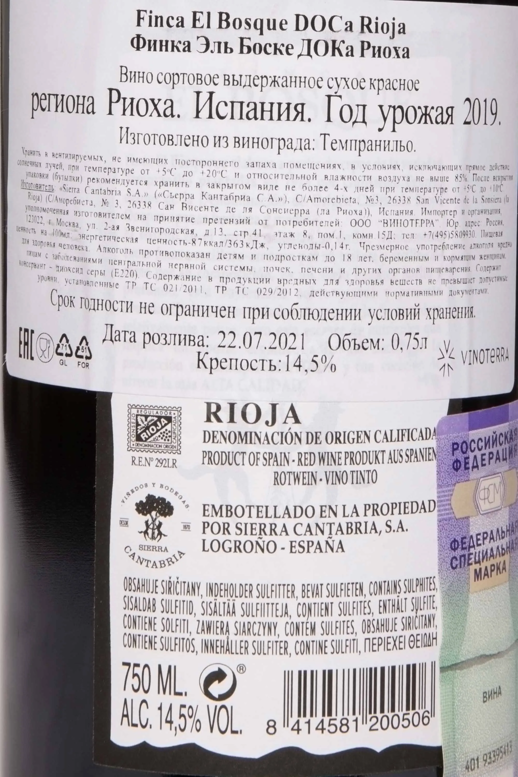 Красное сухое вино Sierra Cantabria Finca El Bosque Rioja DOCa 2019 года 0,75 л создано в современном и вместе с тем традиционном стиле Риохи. Виноград выращен на одноимённом винограднике, расположенном на склонах в зоне Сан-Висенте-де-ла-Сонсьерра. Почвы здесь аллювиальные с высоким содержанием известняка и глины, что придаёт ягодам баланс свежести и силы. Год 2019 в регионе оказался благоприятным: тёплое лето и умеренные осадки обеспечили равномерное созревание. Урожай был ограниченным по объёму, но высокого качества. Ферментация проходила в дубовых чанах с контролем температуры и последующей малолактической ферментацией в бочках. Выдержка длилась около полутора лет в новых барриках из французского дуба. Вино регулярно получает высокие оценки критиков и фигурирует в международных рейтингах как один из самых выразительных терруарных образцов Риохи.