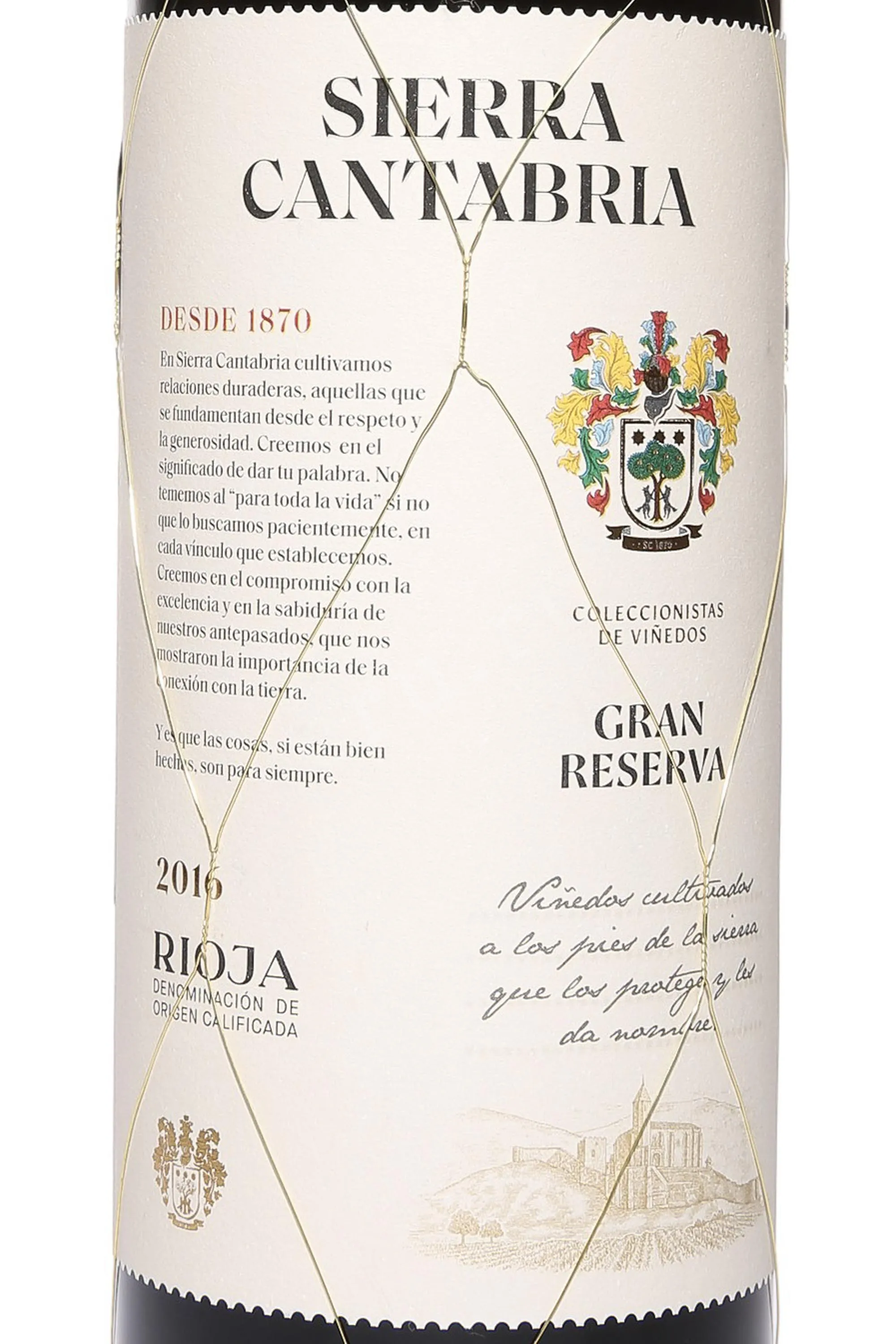 Красное сухое вино Sierra Cantabria Gran Reserva DOCa 2016 года 0,75 л — коллекционное, являющее выразительным представителем классического стиля Риохи с богатой структурой и зрелым характером. Виноград растёт в терруаре Sonsierra на окраине Rioja Alta у подножия гор Сьерра Кантабрия. Почвы здесь — глинисто-известковые, расположенные на слоях песчаника, что придаёт вину минеральную основу и изысканную глубину. Климат континентальный с атлантическим влиянием. В процессе производства применяется двойной ручной отбор гроздей, полный отказ от механизации. Ягоды полностью очищают от гребней и прессуют. Ферментация проходит при контролируемой температуре в нержавеющей стали с использованием местных дрожжей. Мацерация длится до 30 дней, затем — малолактическая ферментация в дубовых бочках. Выдержка в американском дубе (часть бочек новые) длится около 26 месяцев. Это вино сочетает сложность ароматики с плотной плодовой структурой. Имеет высокие оценки международных критиков, отмечающих гармонию, глубину и долгий потенциал выдержки.