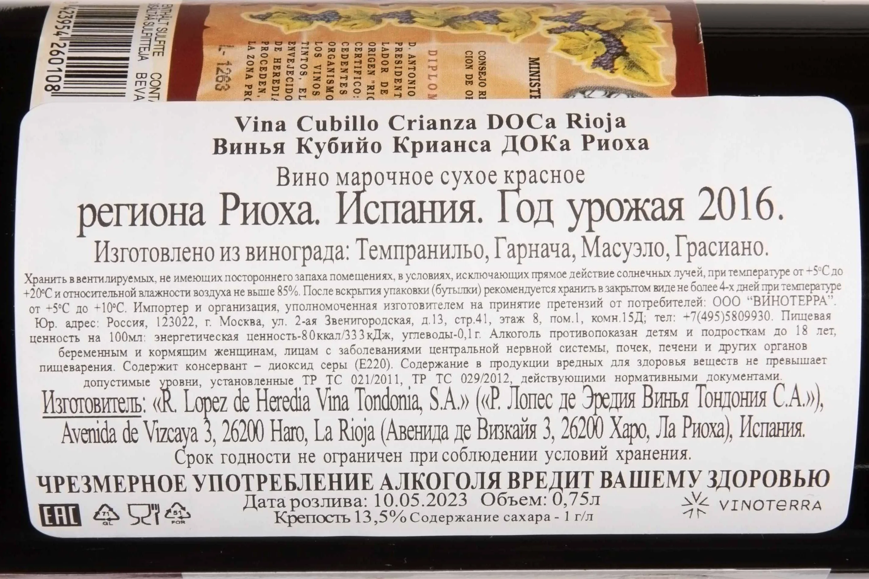 Красное сухое вино Vina Cubillo Crianza Rioja DOC 2016 года 0,75 л — классический представитель традиционного стиля Риохи с ярким, но гармоничным характером. Виноградники расположены в Риоха Альта на глинисто-известняковых почвах с хорошим дренажем. Климат здесь умеренный с теплыми днями и прохладными ночами, что способствует сохранению кислотности и насыщенности вкуса. Урожай 2016 года был удачным: умеренное лето и солнечная осень позволили ягодам достичь оптимальной зрелости. Виноград собирали ручным способом со старых 50-летних лоз. Ферментация протекала в больших дубовых емкостях с природными дрожжами, затем вино выдерживали около 3 лет в бочках из американского дуба и не менее года в бутылке перед выпуском. Это придало вкусу мягкость, сложность и длительность. Вино высоко оценено критиками и входит в список эталонных образцов Риохи. Оно имеет хороший потенциал для развития — минимум 10 лет. Известные критики Джеймс Саклинг и Роберт Паркер поставили винтажу 2016 года по 94 балла, а Wine Spectator — 90 баллов («Незаурядное вино»).