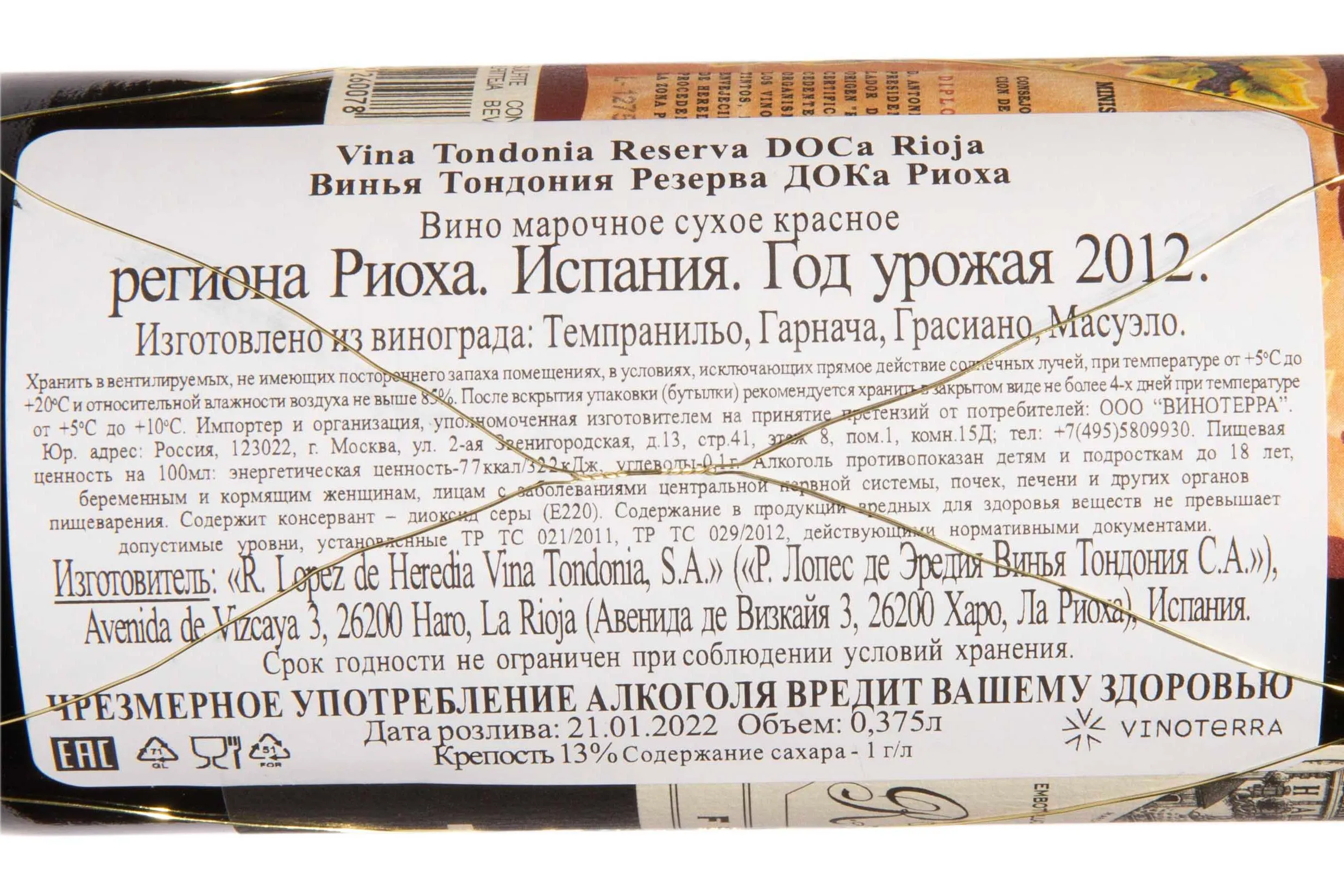 Красное сухое вино Vina Tondonia Rezerva Red Dry DOCa Rioja 2012 года 0,75 л относится к классическому стилю старой Риохи, где ценится не сила, а благородная элегантность. 2012 год был одним из самых сухих за десятилетие: осадков выпало на четверть меньше нормы, из-за чего урожайность снизилась, но ягоды оказались исключительно здоровыми и концентрированными. Это позволило создать вино с отличным потенциалом к долгой выдержке. Виноград собран с собственных 100 гектаров виноградников хозяйства, расположенных на изгибе реки Эбро. Ферментация протекала в старинных дубовых чанах, которым около 140 лет, без контроля температуры и без яблочно-молочного брожения. Созревание длилось не менее шести лет в подвалах в бочках из американского дуба с регулярным переливом для отделения осадка. Перед бутилированием вино слегка осветлили, но не фильтровали. Винтаж 2010 года раскрывается со временем и способен развиваться в бутылке до двадцати лет.