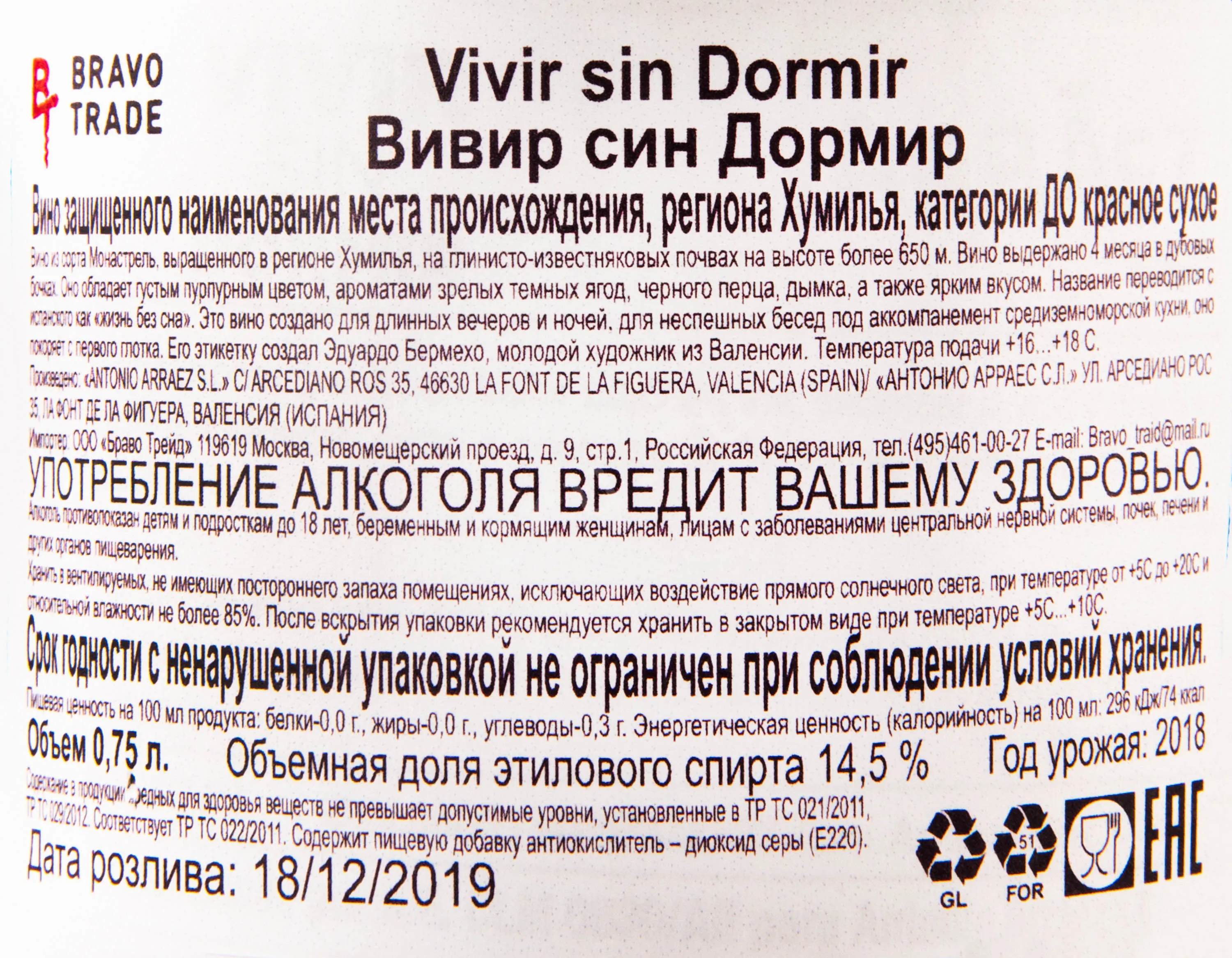Vivir sin Dormir Jumilla DO 0.75 л купить - Испанское вино Вивер син Дормир цена в магазине г. Москва, ул. Профсоюзная, д. 16/10 10:00-22:00 Ежедневно +7 (495) 920-20-02 info@cru.ru