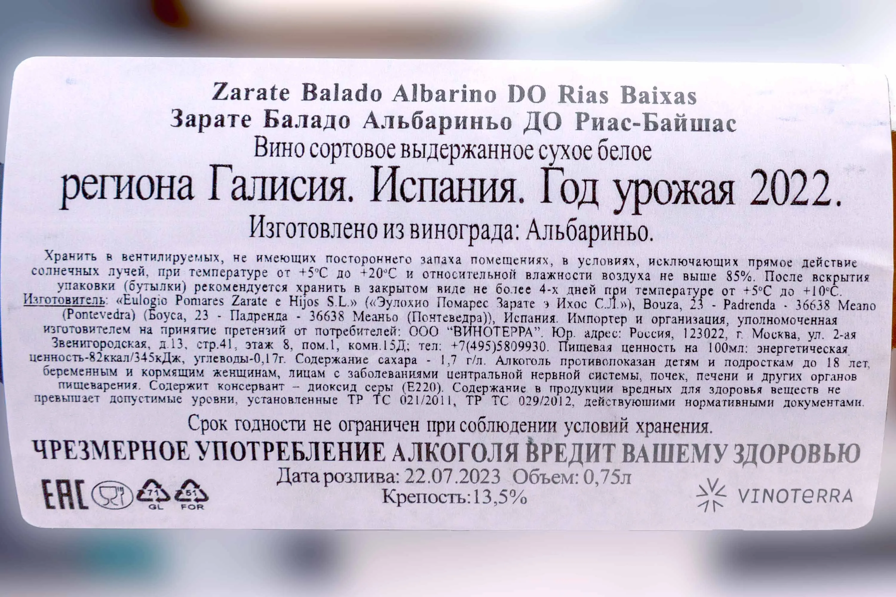 Белое сухое вино Zarate Balado Albarino Rias Baixas 2022 года 0,75 л создано в Галисии, в зоне Риас Байшас, которая известна своим атлантическим климатом. Виноградники Баладо расположены на гранитных почвах, что придает вину минеральный характер. 2022 год отличался мягкой зимой, умеренным летом и достаточным количеством осадков, что обеспечило равномерное созревание ягод. Сбор винограда проводили вручную. Ферментацию проводили в стальных емкостях с контролем температуры, чтобы сохранить свежесть и ароматический потенциал сорта. Выдержка на осадке продолжалась несколько месяцев, благодаря чему вино приобрело дополнительную глубину и текстуру. Версия из урожая 2022 года получила 94/100 балла от Роберта Паркера («Экстраординарное вино»). Потенциал развития в бутылке составляет 7-8 лет.