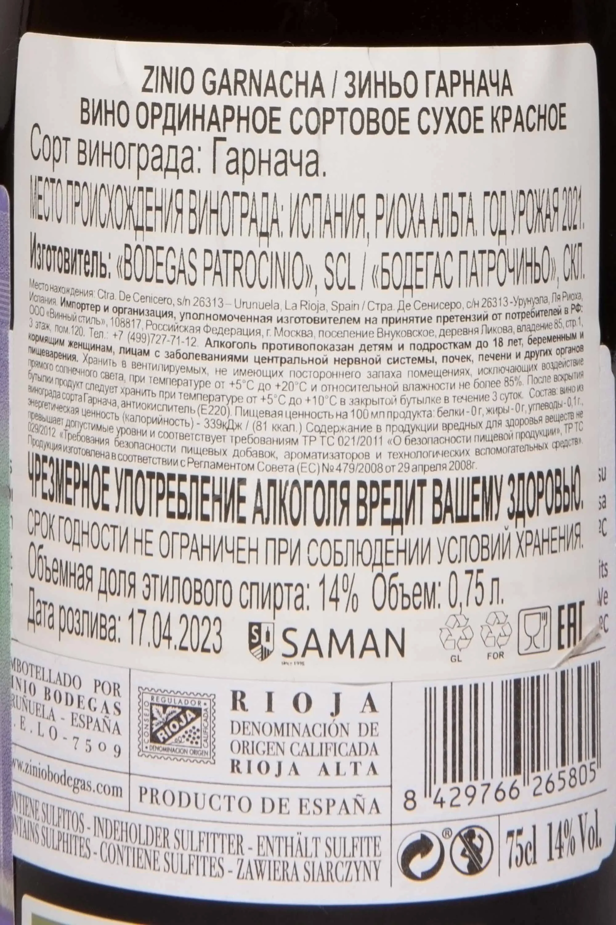 Красное сухое вино Zinio Garnacha 2021 года 0,75 л создано в классическом стиле Риохи, с акцентом на свежесть и выраженный сортовой характер. Виноград был выращен в регионе Rioja Alta, на участках с известково-глинистой почвой, в зоне умеренного климата. Урожай 2021 года в Риохе был успешным: весна прошла мягко, лето оказалось теплым, но без экстремальной жары, что позволило ягодам сохранить баланс сахара и кислотности. Ферментация проходила в стальных емкостях при контролируемой температуре, что помогло сохранить ароматический профиль сорта. Кратковременная выдержка усилила структуру вина, сохранив при этом его живость и фруктовую основу.