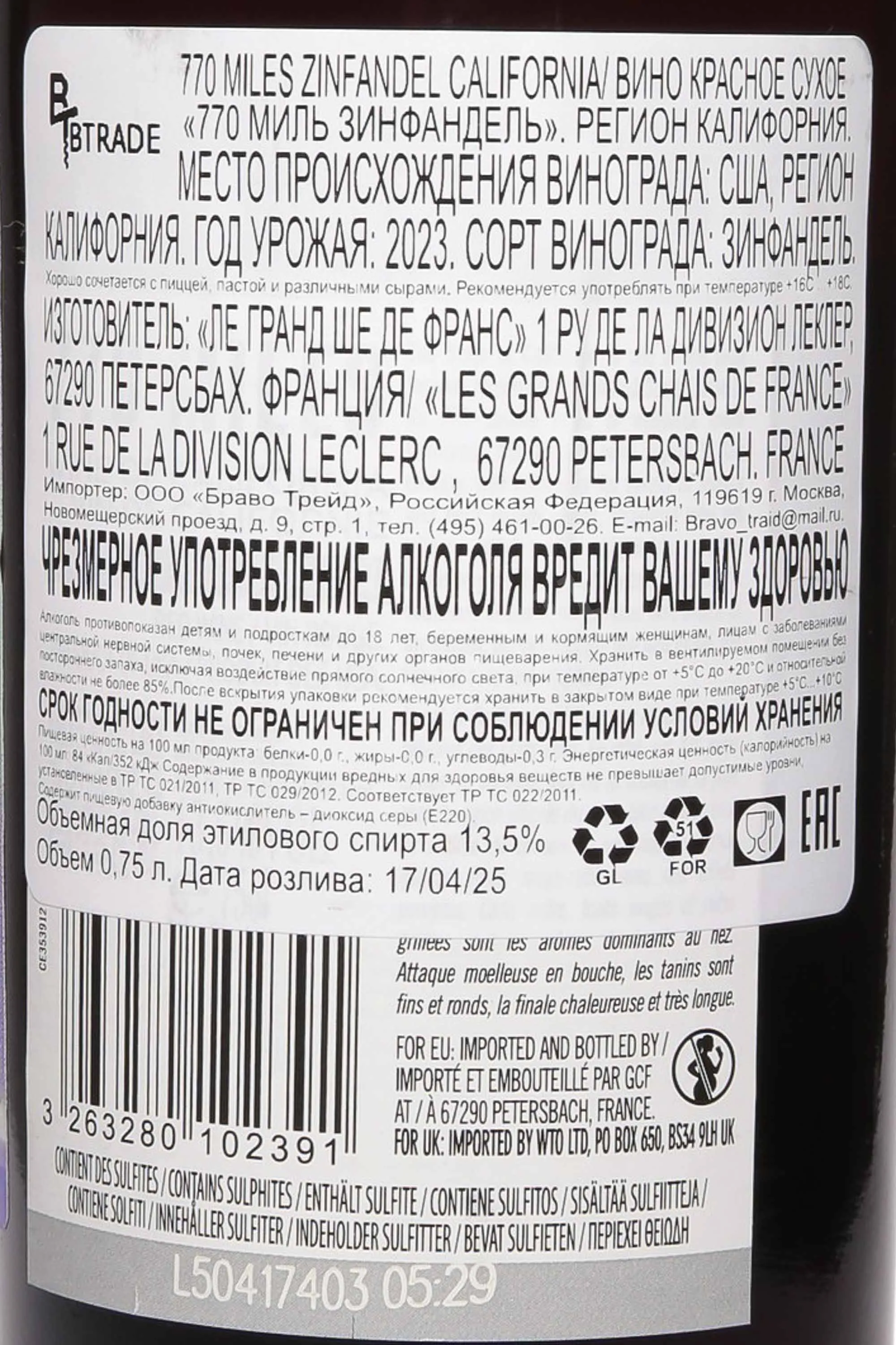 Красное сухое вино 770 Miles Zinfandel 2023 года 0,75 л создано в солнечной Калифорнии, регионе с идеальными условиями для выращивания сорта Зинфандель. Виноградники расположены на плодородных почвах Центральной долины, где жаркие дни и прохладные ночи способствуют равномерному созреванию ягод. Урожай 2023 года стал удачным для виноделов: сезон отличался умеренными температурами и большим количеством солнечных дней, благодаря чему ягоды набрали насыщенный аромат и глубокий цвет. Вино производилось по классической технологии: ферментация проходила в стальных емкостях при контролируемой температуре, а затем следовала выдержка в дубовых бочках, что придало мягкость и лёгкие ноты ванили. 770 Miles Zinfandel отличается гармоничным стилем, в котором чувствуются характерные черты калифорнийского терруара — зрелость, фруктовость и структура.