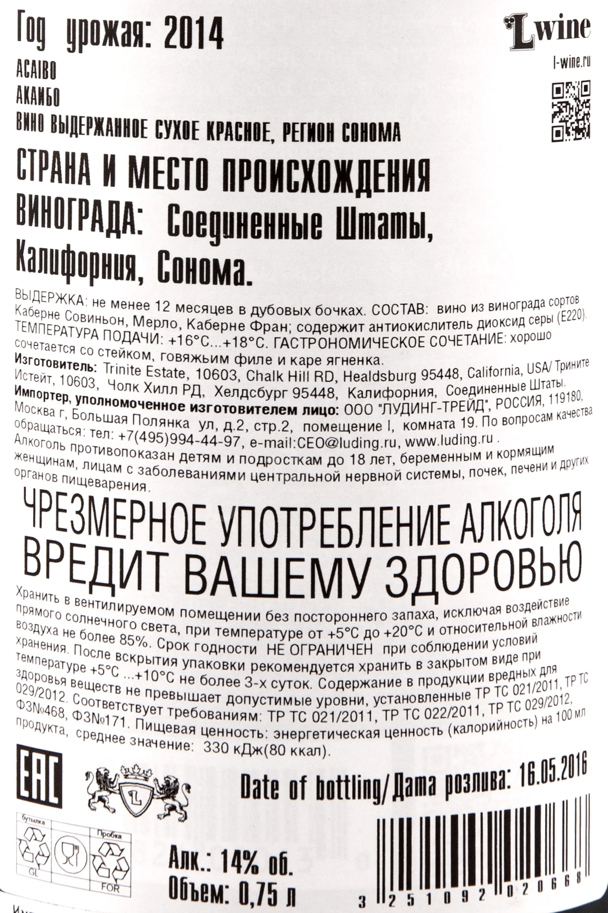 Acaibo Trinite Estate 2014 0.75 л купить - Американское вино Акаибо Трините Истейт 2014 цена в магазине г. Москва, ул. Профсоюзная, д. 16/10 10:00-22:00 Ежедневно +7 (495) 920-20-02 info@cru.ru