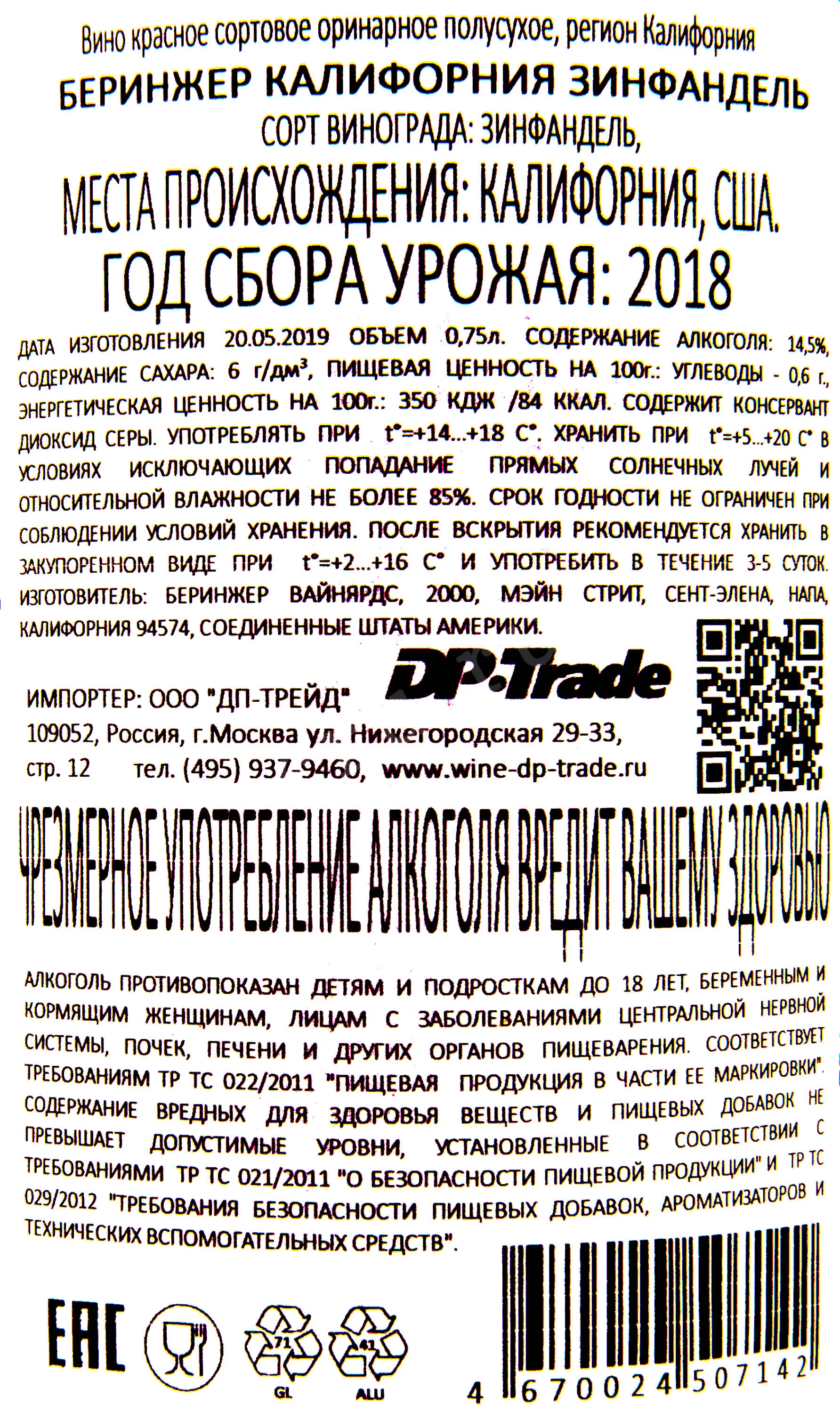Beringer Zinfandel 0.75 л купить - Американское вино Беринжер Зинфандель цена в магазине