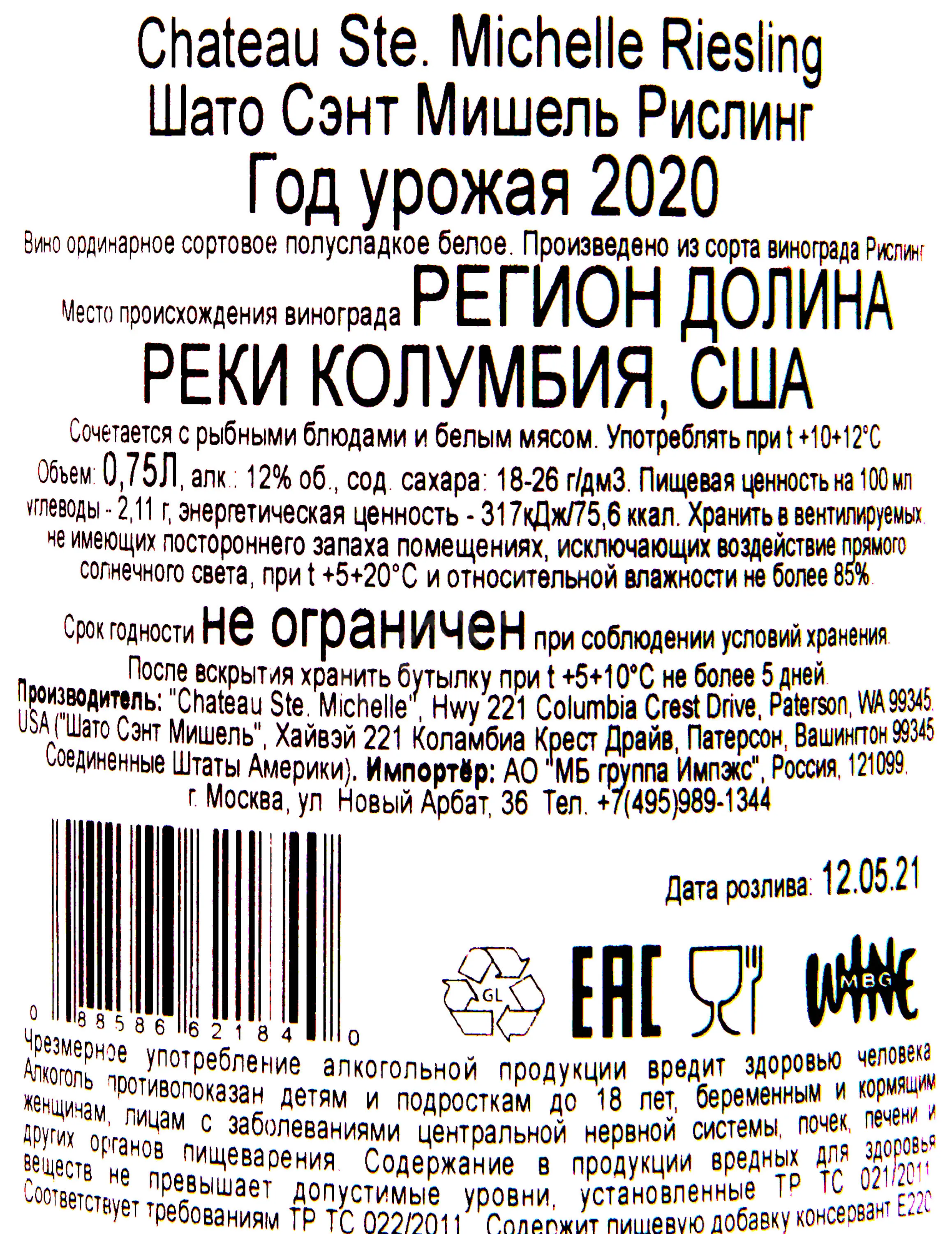 Chateau Ste Michelle Riesling 0.75 л купить - Американское вино Шато Сент Мишель Рислинг цена в магазине г. Москва, ул. Профсоюзная, д. 16/10 10:00-22:00 Ежедневно +7 (495) 920-20-02 info@cru.ru