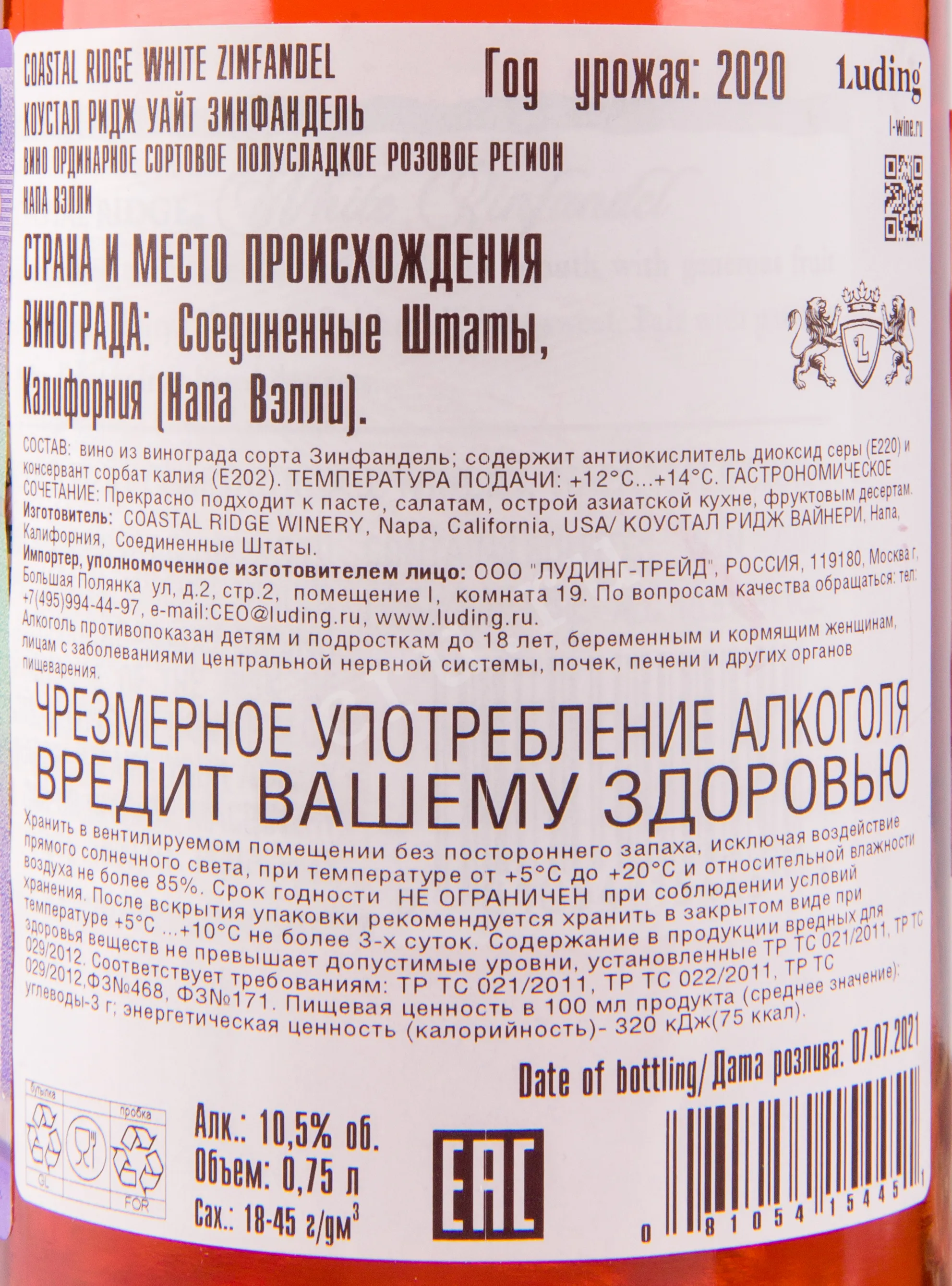 Coastal Ridge White Zinfandel 0.75 л купить - Американское вино Коустал Ридж Уайт Зинфандель цена в магазине