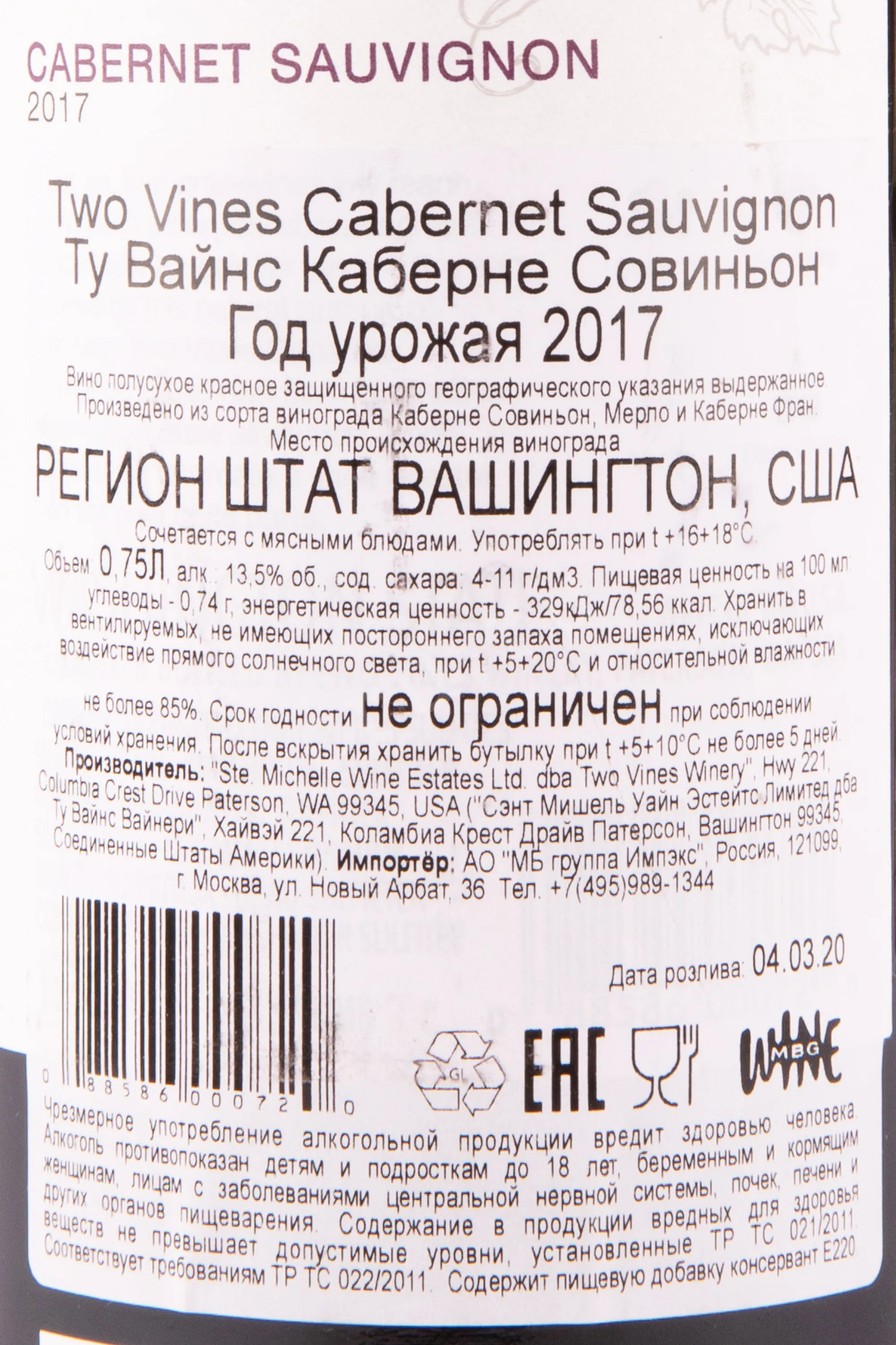 Columbia Crest Two Vines Cabernet Sauvignon 0.75 л купить - Американское вино Коламбиа Крест Ту Вайнс Каберне Совиньон цена в магазине г. Москва, ул. Профсоюзная, д. 16/10 10:00-22:00 Ежедневно +7 (495) 920-20-02 info@cru.ru