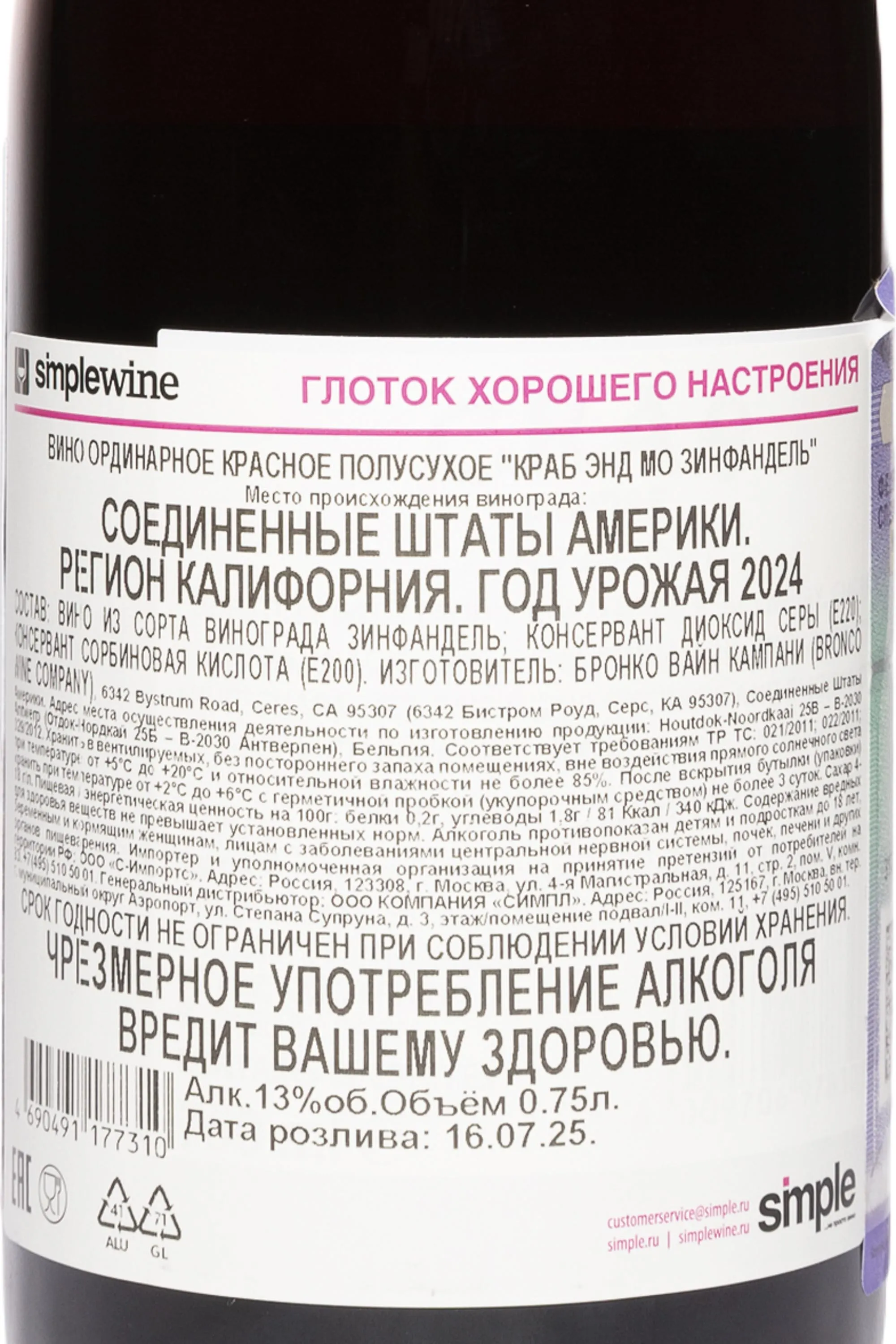 Красное полусухое вино Crab & More Zinfandel 2024 года 0,75 л — элегантный калифорнийский Зинфандель с мягкой фруктовой стилистикой, созданный специально для сопровождения блюд из морепродуктов. Виноград выращивается в терруаре с ярко выраженным контрастом климата: теплые внутренние долины и прохладные прибрежные участки создают оптимальные условия для созревания ягод с насыщенным вкусом. Почвы известняково-мергелевые, песчаные и суглинистые, что придает вину минеральную свежесть. 2024 год отличился стабильной погодой, без резких перепадов температур, что позволило получить сбалансированное сырье. Проводились мягкое прессование и короткая мацерация при низкой температуре. Ферментация проходила при 14-15 градусах. Выдержка осуществлялась в стальных емкостях, что подчеркнуло чистоту и свежесть вкуса.