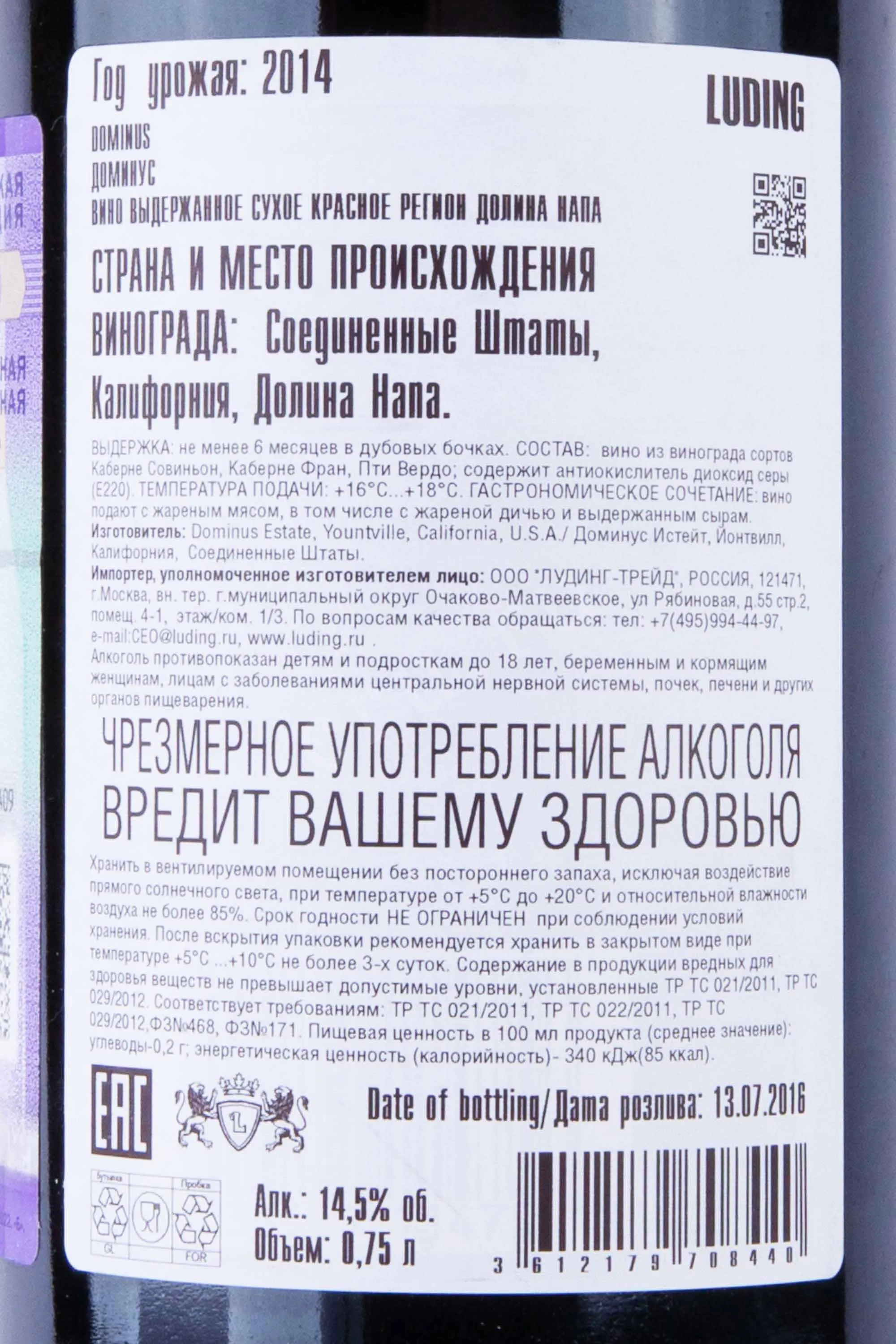Вино Dominus Estate 2014 0.75 было создано на историческом участке Napanook в Йонтвиле, сердце Долины Напа, где первые лозы появились ещё в XIX веке. Хозяйство развивал Кристиан Муэкс — представитель знаменитой бордоской семьи и управляющий Château Pétrus, увидевший в этих почвах редкое сходство с гравийными терруарами Бордо. Каменисто-аллювиальные почвы с отличным дренажем и тёплый, сбалансированный сезон 2014 года позволили ягодам достичь полной фенольной зрелости без потери свежести. Урожай собирали вручную, проводили тщательную селекцию, ферментацию осуществляли в стальных чанах с контролем температуры. Выдержка продолжалась около 18 месяцев во французских барриках, из которых значительная часть была новой.