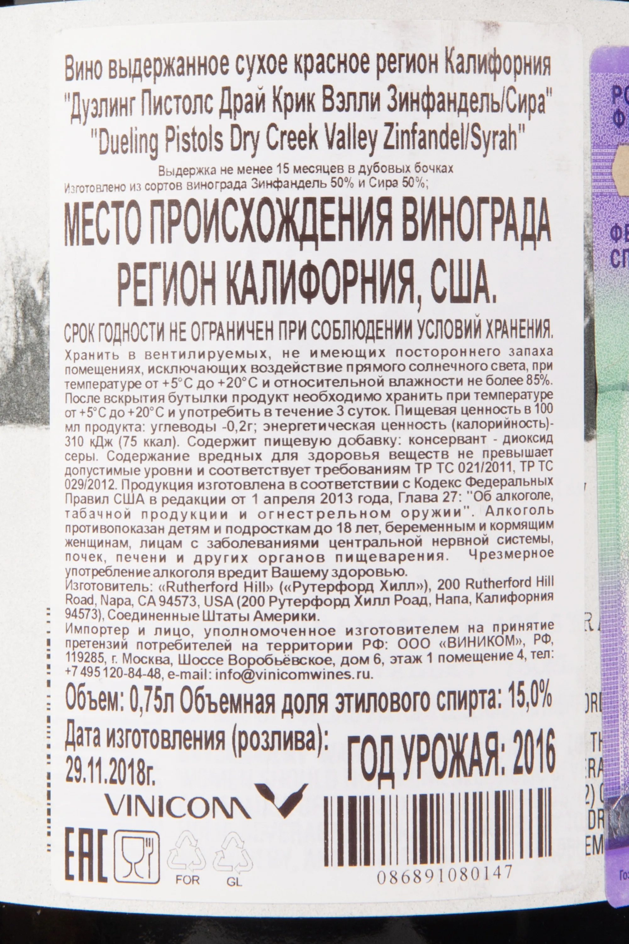 Dueling Pistols Dry Creek Valley Zinfandel Syrah 2016 0.75 л купить - Американское вино Дуэлинг Пистолс Драй Крик Вэлли Зинфандель Сира цена в магазине