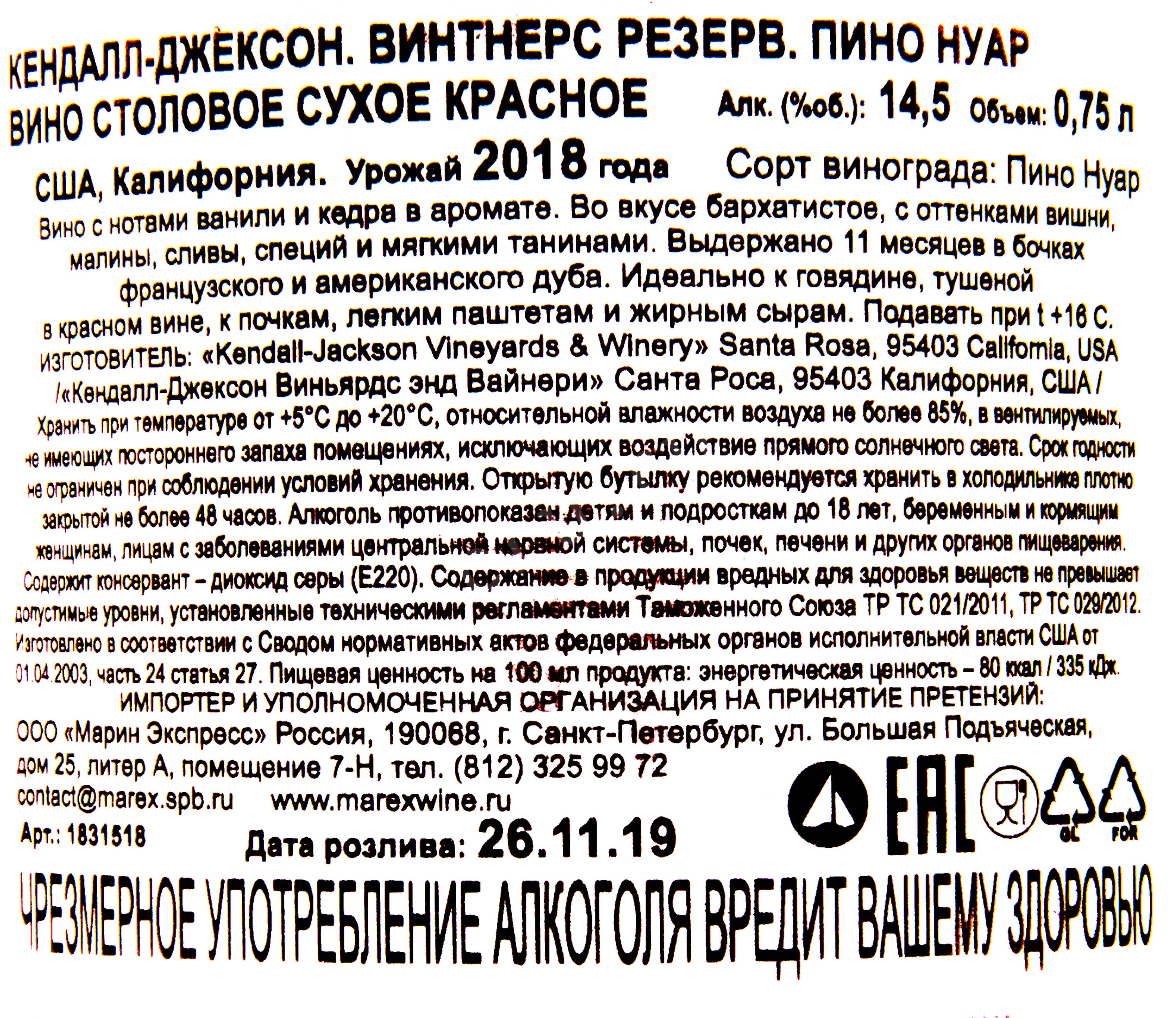 Kendall-Jackson Vintner`s Reserve Pinot Noir 2018 0.75 л купить - Американское вино Кендалл-Джексон Винтнерс Резерв Пино Нуар цена в магазине г. Москва, ул. Профсоюзная, д. 16/10 10:00-22:00 Ежедневно +7 (495) 920-20-02 info@cru.ru