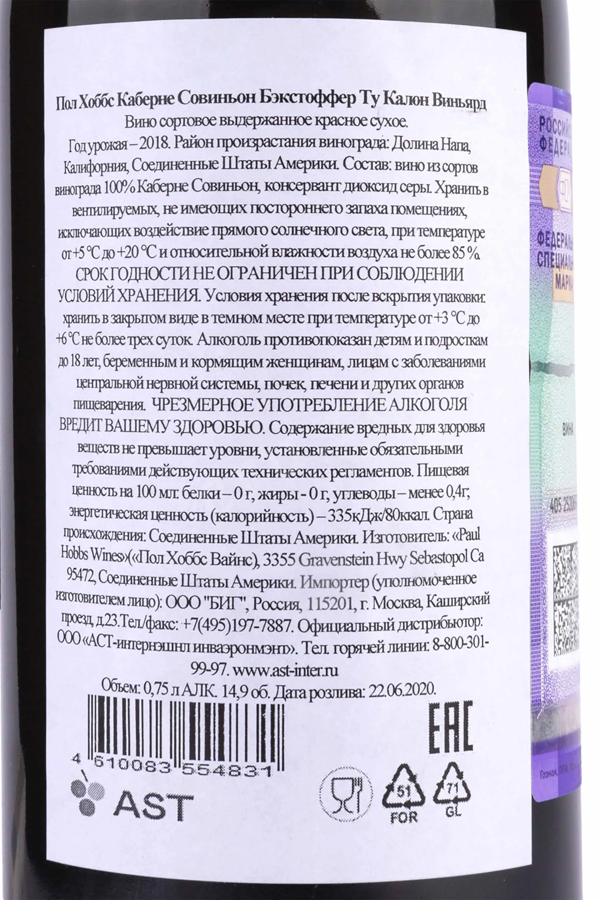 Пол Хоббс Бэкстоффер То Калон Виньярд Каберне Совиньон 0.75