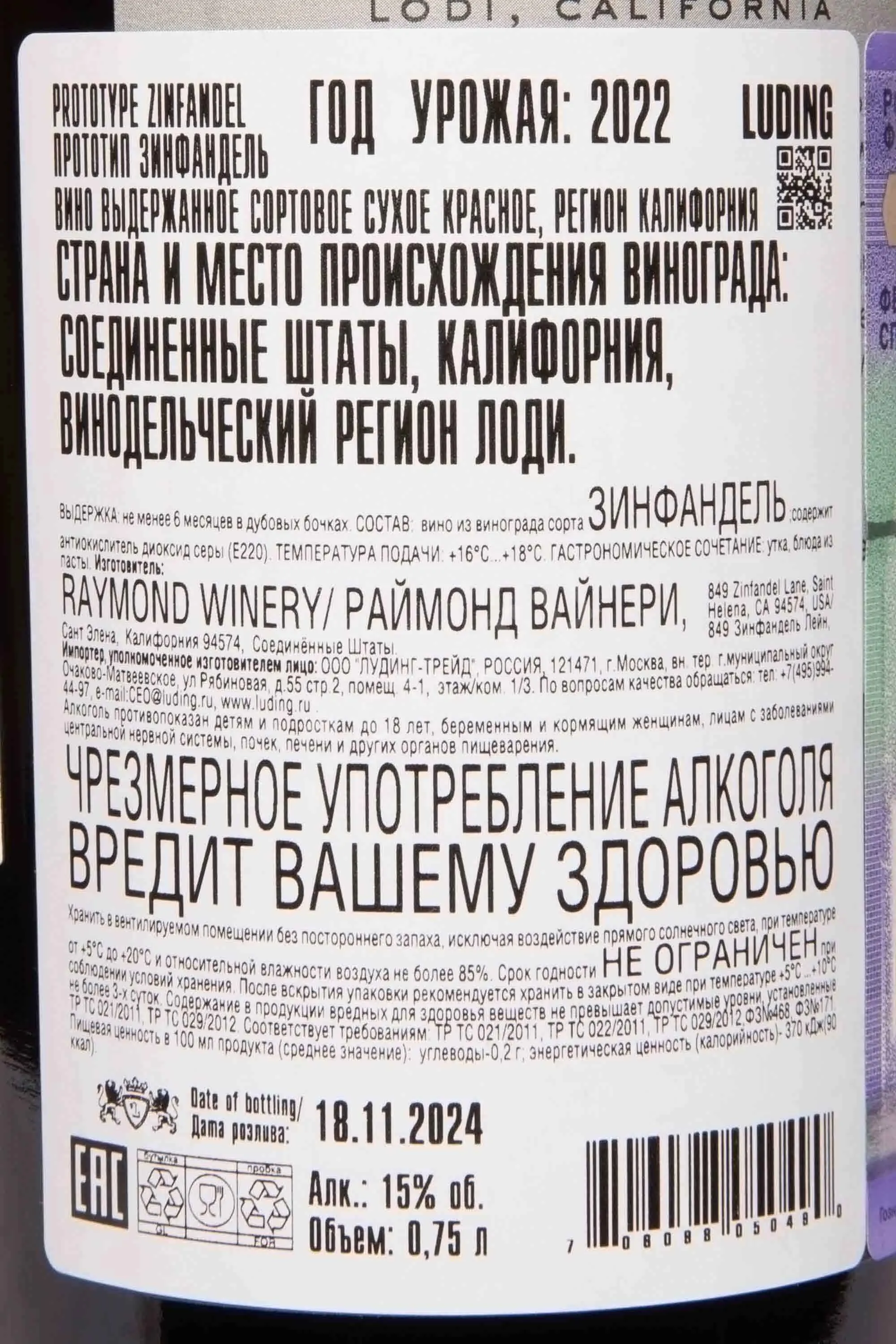 Красное сухое вино Prototype Zinfandel 2022 года 0,75 л произведено из винограда со старых лоз, выращенных в регионе Лоди, который называют мировой столицей Зинфанделя. Терруар отличается теплыми днями и прохладными ночами. Сухие, хорошо дренированные песчаные почвы заставляют лозы развивать глубокую корневую систему. Это придает ягодам высокую концентрацию и насыщенность. Урожай 2022 года созревал при стабильной теплой погоде с освежающим океанским бризом. Виноград собирали в фазе полной спелости, затем тщательно сортировали и дробили. Мацерация и ферментация проходили в стальных резервуарах при контролируемой температуре. После мягкого прессования и яблочно-молочного брожения вино выдерживали 13 месяцев в бочках из американского дуба. Выдержка добавила структуру и пряные оттенки. Винтаж 2022 года способен развиваться в бутылке. Он получил 91/100 баллов от Wine Enthusiast («отличное вино»).