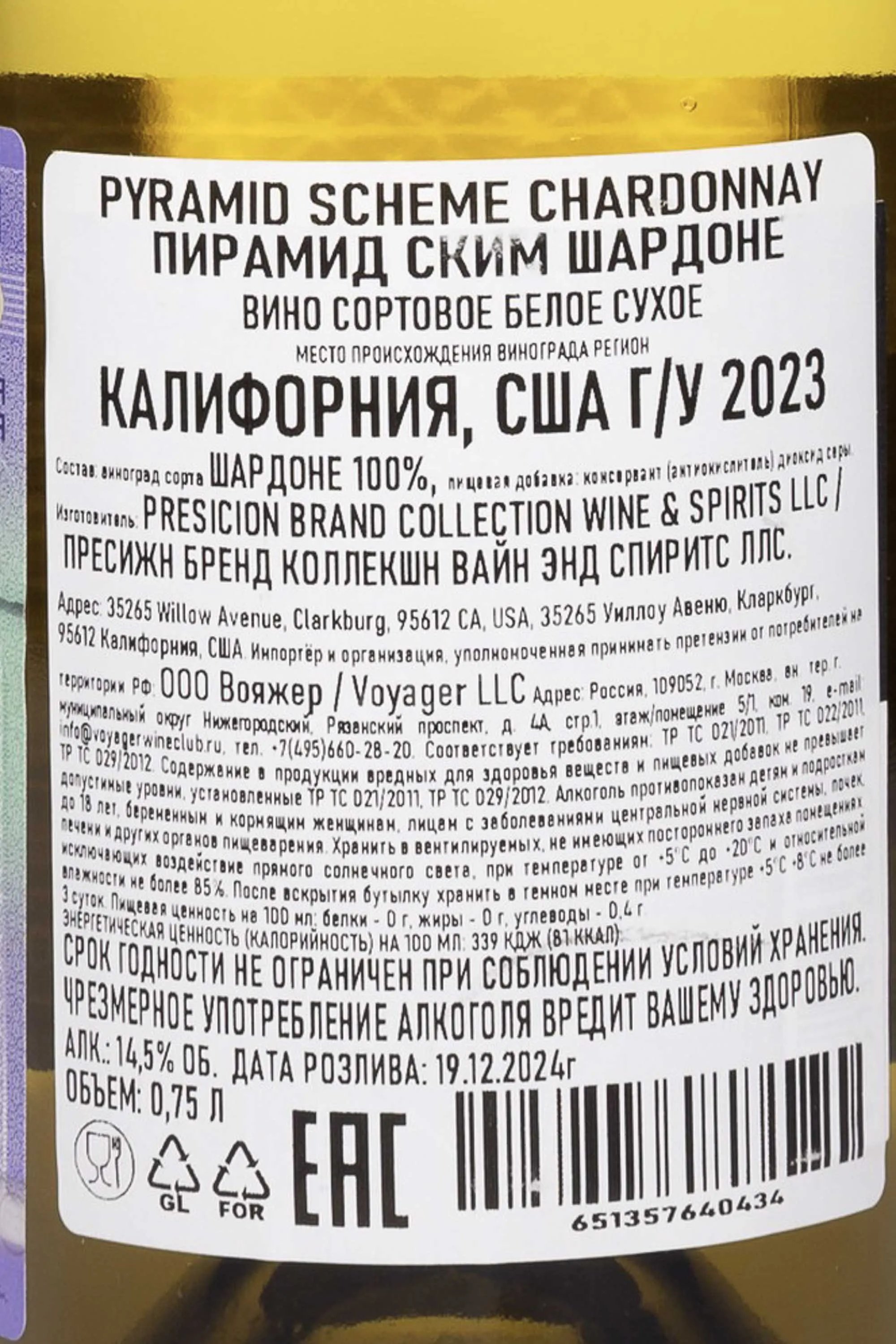 Белое сухое вино Pyramid Scheme California Chardonnay 2023 года 0,75 л создано в солнечной Калифорнии, где мягкий климат и близость Тихого океана формируют идеальные условия для зрелости винограда. Урожай 2023 года оказался удачным: умеренные температуры и долгий вегетационный период обеспечили равновесие кислотности и фруктовой полноты. Виноград выращен на прибрежных склонах, где почвы богаты минералами и хорошо пропускают влагу. Ферментация проходила в нержавеющих емкостях с контролем температуры, часть вина выдерживалась в дубовых бочках (старых и новых) для придания структуры и легких ванильных оттенков. Пирамид Ским — современный проект, известный вниманием к деталям и яркой стилистикой вин. Шардоне 2023 отмечено критиками за баланс свежести и выразительности, часто упоминается как одно из наиболее интересных вин в своем ценовом сегменте.