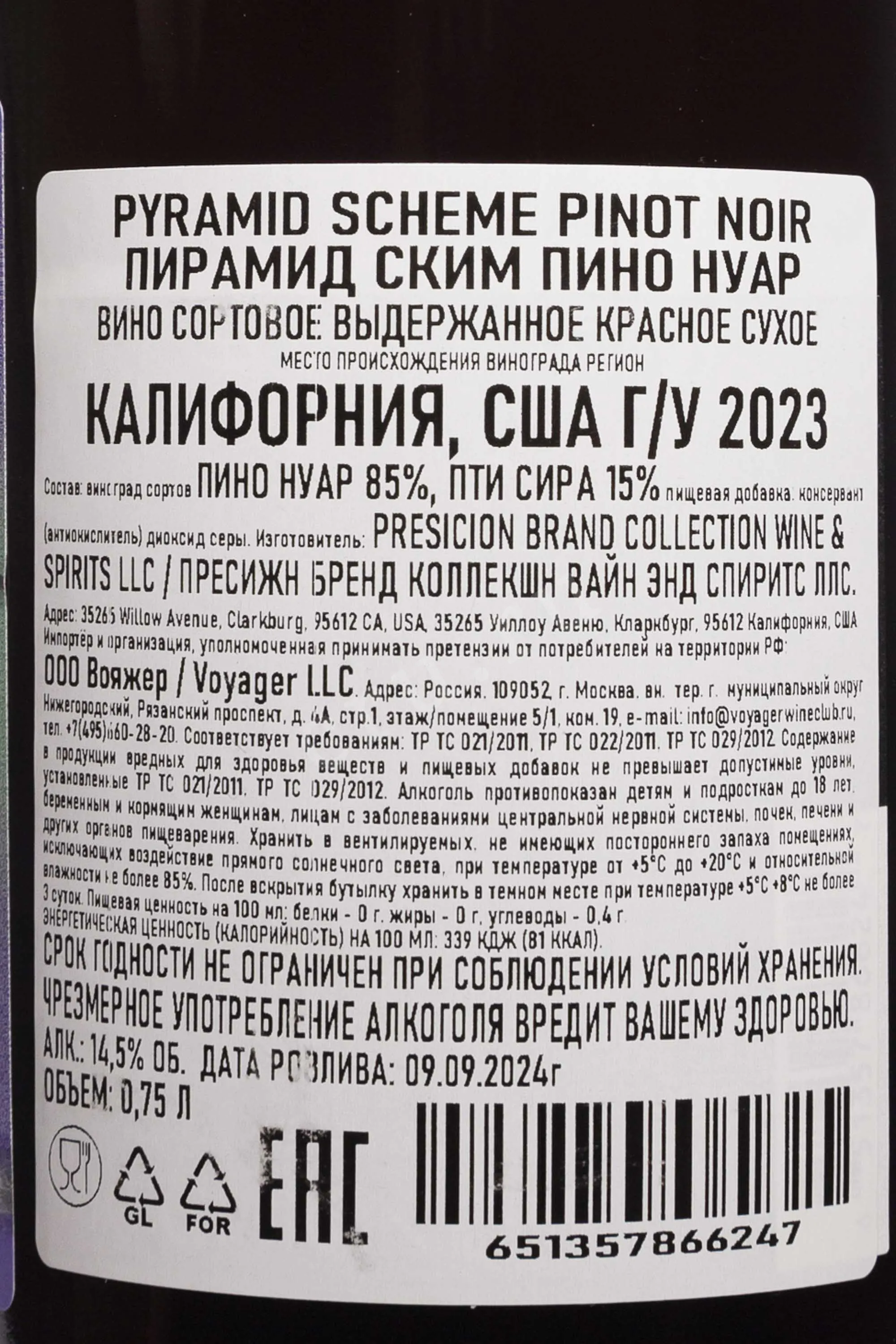 Красное сухое вино Pyramid Scheme California Pinot Noir 2023 года 0.75 л сделано в Калифорнии в современном стиле и отличается чистым фруктовым профилем. Виноград для него выращивается в зоне с мягким климатом, что обуславливает продолжительный вегетационный период, медленное созревание ягод и формирование сбалансированной кислотности. Урожай 2023 года считается удачным: стабильная погода без экстремальной жары позволила сохранить свежесть и ароматическую выразительность сортов, входящих в купаж. Сбор винограда проводили вручную в начале сентября. Ферментация проходила в стальных емкостях с контролем температуры, что помогло сохранить первичные фруктовые ноты. После этого вино выдерживалось в дубовых бочках 10 месяцев, приобретая глубину и структуру без излишней тяжести. Винтаж 2023 года отмечен высокими оценками: 91/100 Wine Enthusiast и 90/100 James Suckling