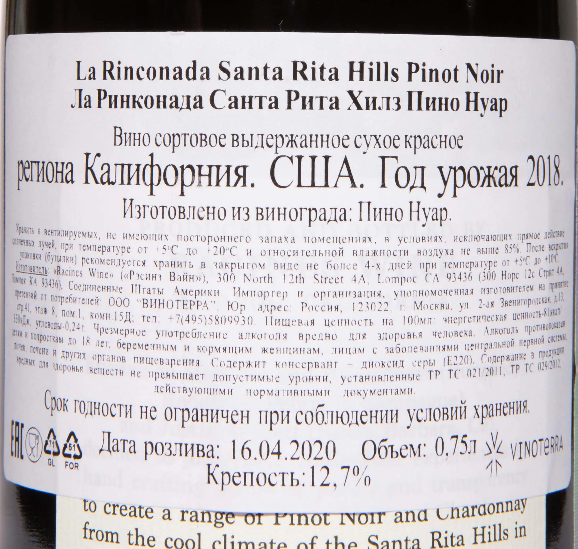 Racines Sta Rita Hills La Rinconada Vineyard Pinot Noir 0.75 л купить - Американское вино Рэсинз Санта Рита Хилз Ла Ринконада Вайнярд Пино Нуар цена в магазине г. Москва, ул. Профсоюзная, д. 16/10 10:00-22:00 Ежедневно +7 (495) 920-20-02 info@cru.ru