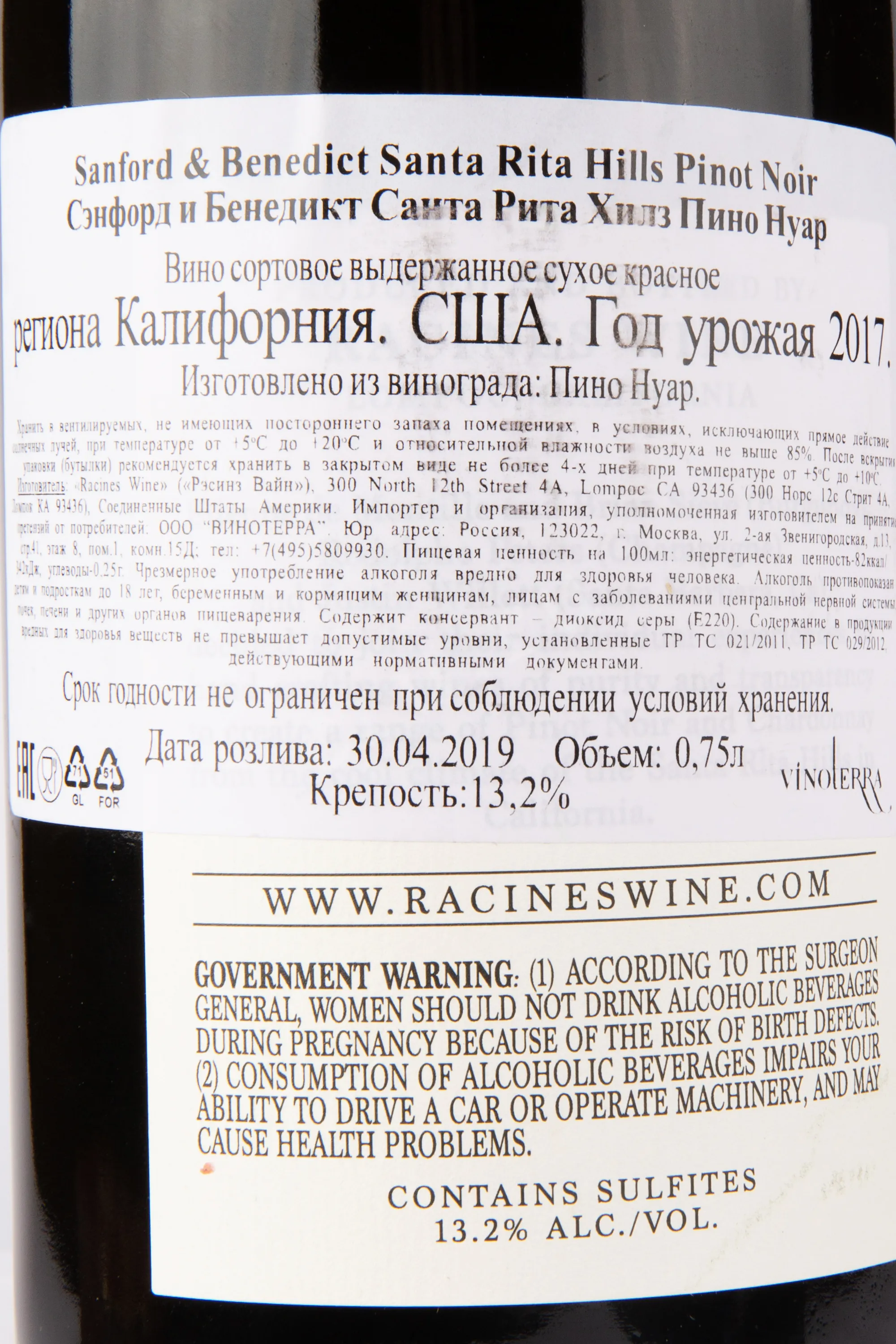 Racines Sanford & Benedict Santa Rita Hills Pinot Noir 2017 0.75 л купить - Американское вино Сэнфорд и Бенедикт Санта Рита Хилз Пино Нуар цена в магазине г. Москва, ул. Профсоюзная, д. 16/10 10:00-22:00 Ежедневно +7 (495) 920-20-02 info@cru.ru