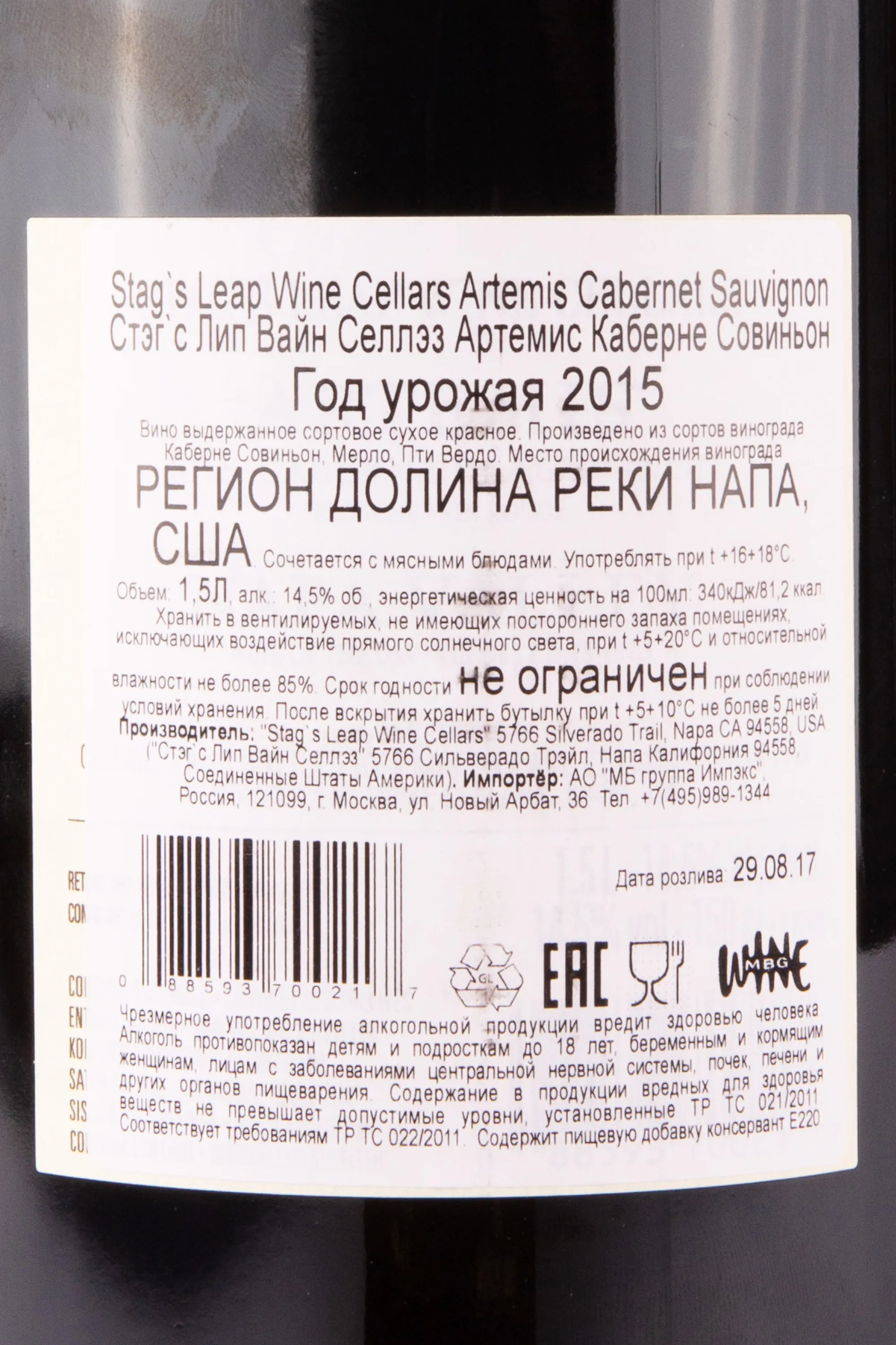 Stags Leap Cellars Artemis Cabernet Sauvignon 2017 1.5 л купить — Американское вино Стэгс Лип Селлэз Артемис Каберне Совиньон цена в магазине КРЮ ПРОФИ