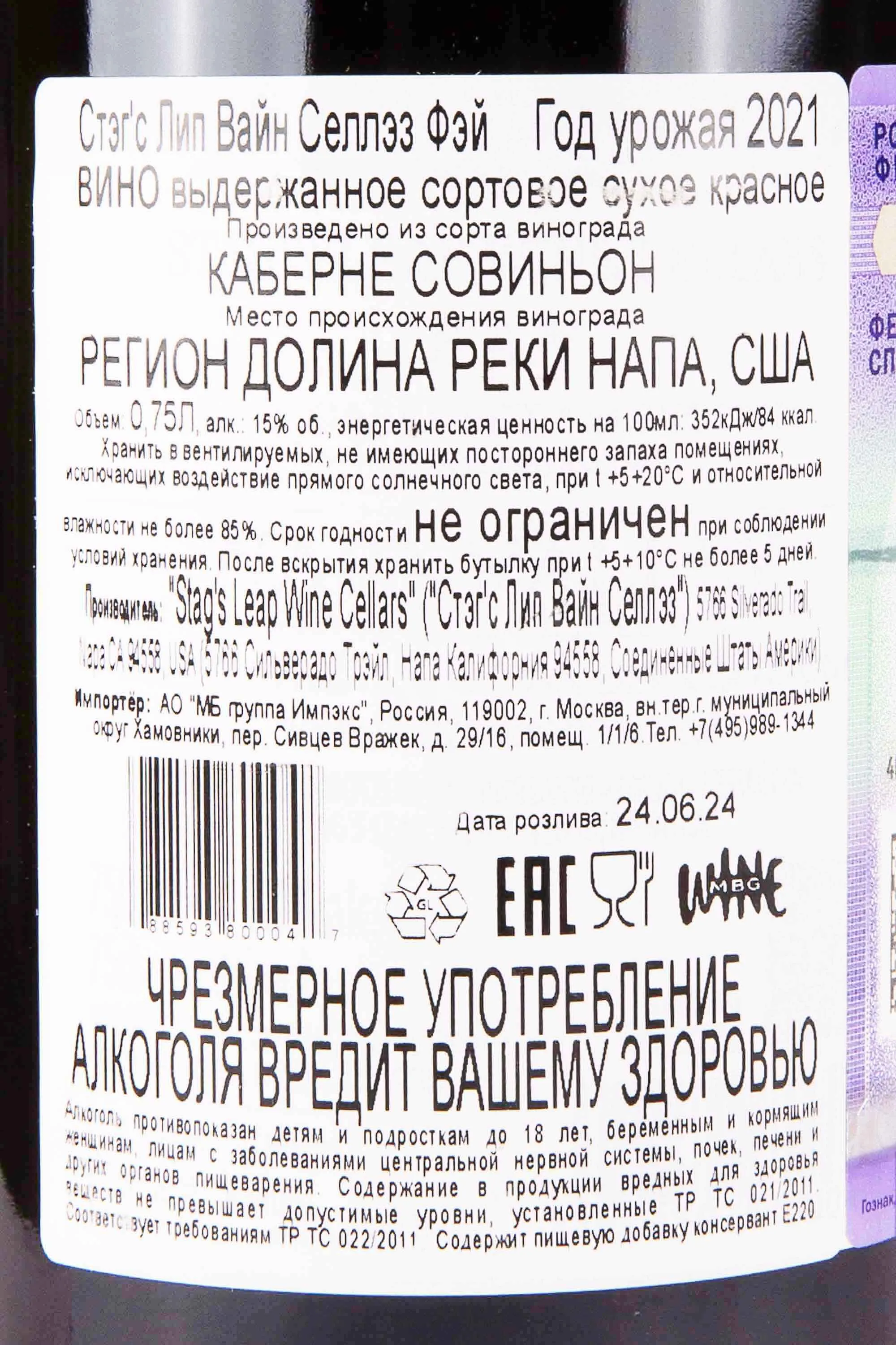 Stags Leap Wine Cellars Fay Cabernet Sauvignon 0.75 л купить - Американское вино Стэгс Лил Вайн Селлэз Фэй Каберне Совиньон 2021 г цена в магазине